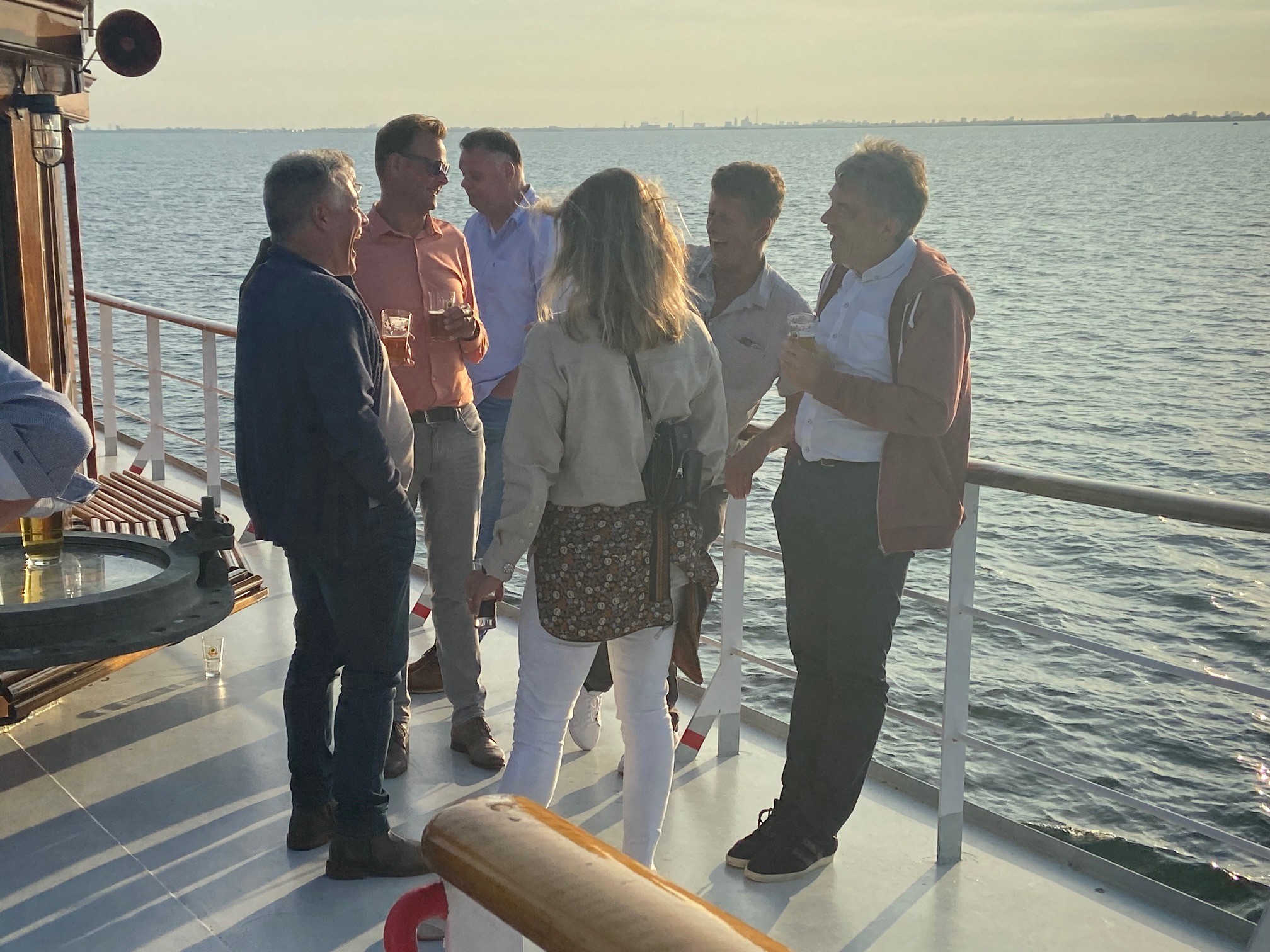 Op de boot worden we welkom geheten door accordeonmuziek en vissersliedjes. Een aantal mensen zoekt binnen een mooi plekje, maar de meesten genieten van het avondzonnetje op het dek. De kapitein kiest het ruime sop, de bemanning zorgt voor een heerlijk dinerbuffet en wij genieten van de zon, het kabbelende water van het IJsselmeer en van de muziek.