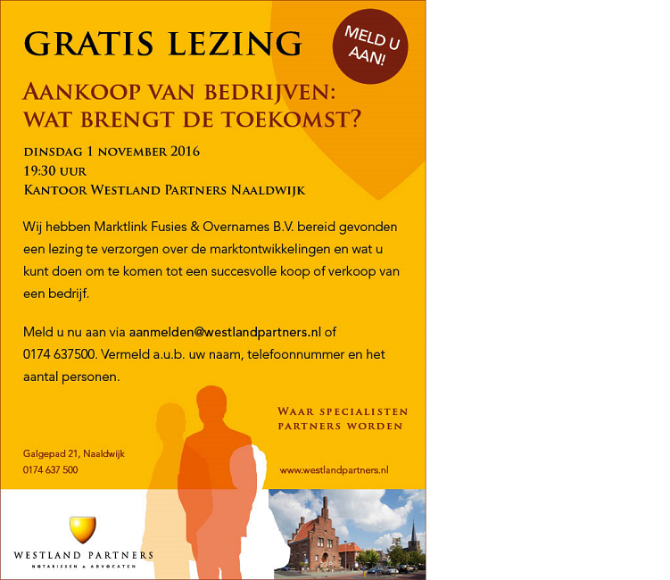 Op dinsdag 1 november aanstaande organiseert Westland Partners, om 19:30 uur, in samenwerking met Marktlink Fusies & Overnames B.V. een lezing waarin zij u alles zullen vertellen over de marktontwikkelingen en wat u kunt doen om tot een succesvolle koop of verkoop van een bedrijf te komen.